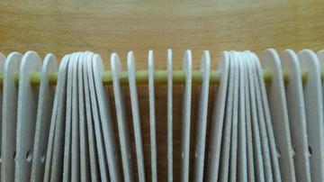 I wanted to try using a fan reed to create undulating patterns. Fan reeds are, however, very expensive so I have fashioned my own using a couple of metal rods, drilled popsicle sticks and--I am most proud of this part--ditalini pasta as spacers. This is give me a chnace to play around...or make soup if the results are not up to scratch.