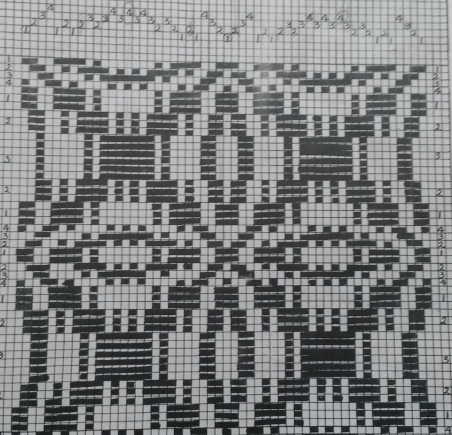 It uses contrasting pattern and ground wefts and can be woven on four or more harnesses. Ususally the warp is the same color, fiber, and size as the ground weft, while pattern weft is normally a contrasting color and usually a bit heavier yarn. Often the pattern yarn is wool, which fulls slightly. Patterns are built up by stacking blocks.
