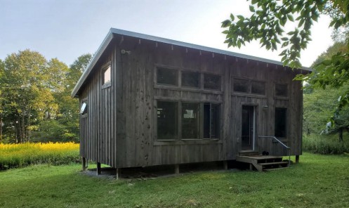 It is a pole building with hemlock board-and-batten siding and corrugated tin roof. A wood stove keeps its cozy, while its northern facing windows bring in wonderful light.