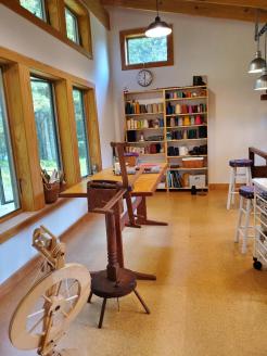 Work on the studio started in July 2016. The looms moved in late May 2017, and the first warp was pulled through the heddles in June.